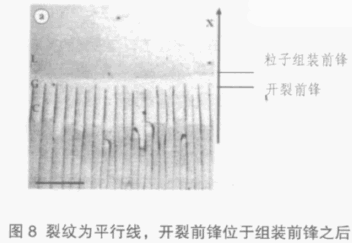 假如分散體因應(yīng)力產(chǎn)生裂紋的話,裂紋通常是一些平行線,并出現(xiàn)一個裂紋前鋒,且裂紋前鋒位于粒子組裝前鋒之后,裂紋前鋒跟隨粒子組裝前鋒推進(jìn)而推進(jìn)。