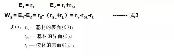這種關系可用潤濕功來解釋:固體的表面能為E1,涂布后為E2涂布前后的表面能差為△E。它就是展布系數,用(S)表示。表面能可用表面張力表示即: