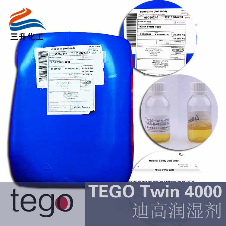 以下為三升貿(mào)易暢銷產(chǎn)品,贏創(chuàng)德固賽迪高助劑基材潤濕劑的TEGO Twin 4000,特別適用于水性配方,可用于印刷油墨低材潤濕,罩印光滑低材潤濕,木器和家具涂料底材潤濕,聚合物乳液和工業(yè)涂料。兼具優(yōu)異的基材潤濕性和良好的消泡性能。