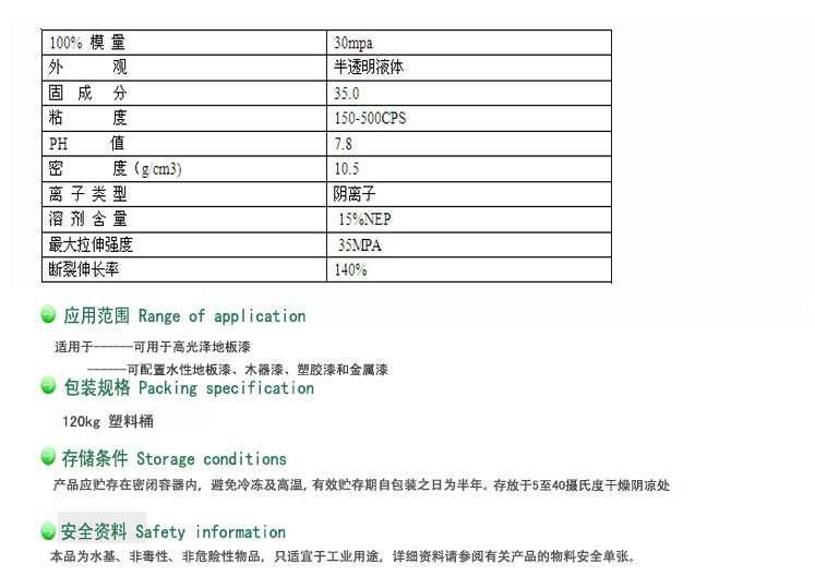 - 為供應(yīng)打印油墨及皮革面漆類客戶,三升推出水性聚氨酯樹脂PU-3339,此款樹脂表面絲滑,中軟,耐失光;耐水優(yōu)異,沸水澆淋,不發(fā)白,不起泡;斷裂伸長率為300-450%;穩(wěn)定性好,耐磨性能優(yōu)異