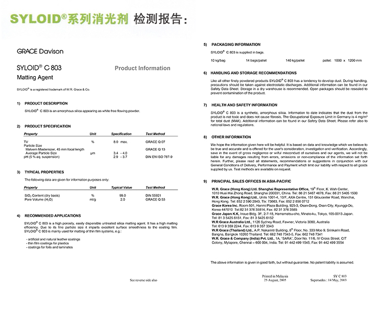 SYLOID系列消光劑是合成的多孔性且顆粒粒徑精確控制的高純度二氧化硅消光劑,應(yīng)用于各種涂料體系都具有優(yōu)良的性能。作為凝膠法二氧化硅消光劑技術(shù)的全球領(lǐng)導(dǎo)者,格雷斯公司自1949年推出SYLOID品牌以來(lái),不斷研發(fā)新的技術(shù)和產(chǎn)品以滿足8益嚴(yán)格的環(huán)保法規(guī)要求。RAD系列消光劑應(yīng)用于100%UV固化涂料: W系列消光劑可以后添加應(yīng)用于水性體系:常規(guī)的SYLOID系列消光劑也可應(yīng)用于水性涂料。因格雷斯公司高品質(zhì)全產(chǎn)業(yè)鏈的質(zhì)量控制,70年來(lái)在涂料應(yīng)用中的穩(wěn)定優(yōu)良性能表現(xiàn),SYLOID消光 劑品牌已成為全球涂料行業(yè)中值得信賴的消光劑品牌。