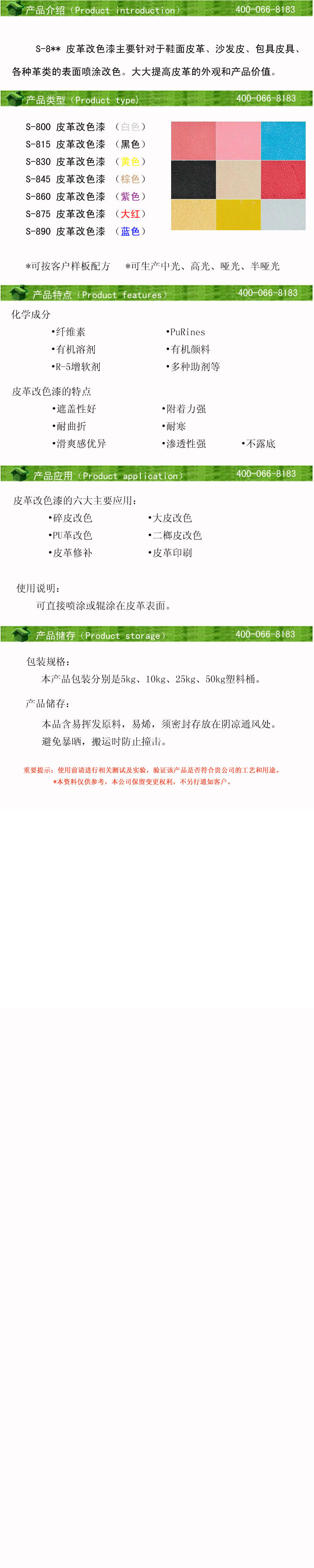 - 能應(yīng)用于合成革、真皮、磨砂皮革、絨面皮革表面增艷噴劑,其特點為:提升鮮艷度、增加滑爽感、養(yǎng)護皮面,能使皮面艷麗、提升價值感。