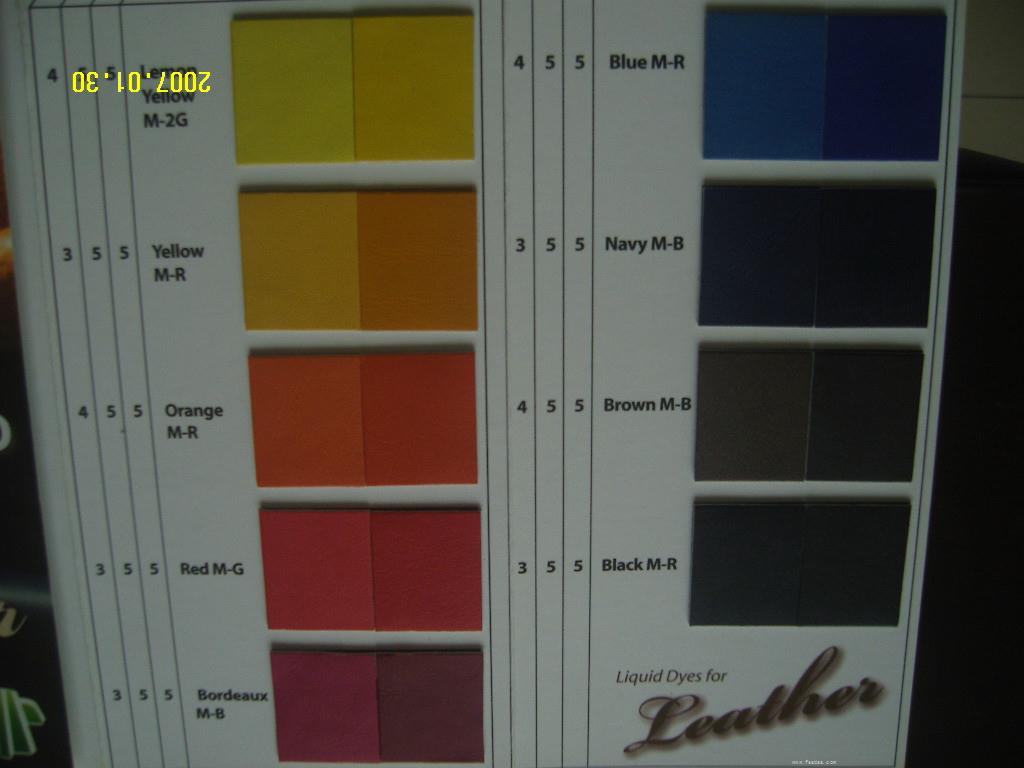 皮革水性染料色精:金屬絡(luò)合染料色精液體有良好親水性,相容性,色彩艷麗適合皮革侵染,噴染涂飾。進(jìn)口水性色精采用復(fù)合型金屬絡(luò)合配方。游離重金屬符合國際標(biāo)準(zhǔn)。國家SGS環(huán)保檢測認(rèn)證。